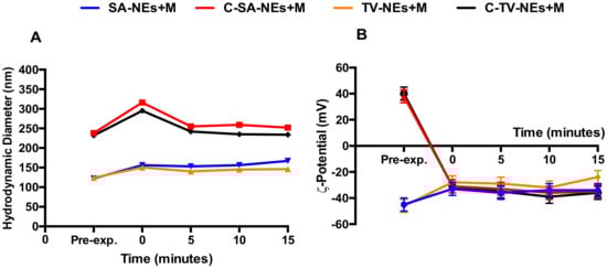 To assess biological stability, hydrodynamic diameter and ζ-potential variations were evaluated in an aCSF medium. No statistically significant changes were observed for TV-NEs either in size within 3 h after addition of aCSF or ζ-potential for (Figure 2A,B). On the other hand, SA-NEs hydrodynamic diameter appeared to be affected by the presence of aCSF, without any ζ-potential variation.