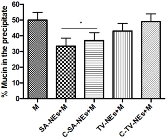 Mucoadhesive efficiency of nanoemulsions: Mucin interaction evaluating the percent of precipitated mucin (* = p < 0.05 SA samples when compared with mucin).
