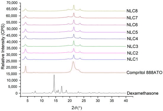 To investigate the solid state of the API in the lipid matrix, XRD measurements were applied. The presence of the characteristics peaks of the API can indicate its crystalline state, while their absence can suggest its amorphous or molecularly dispersed state in the lipid matrix.