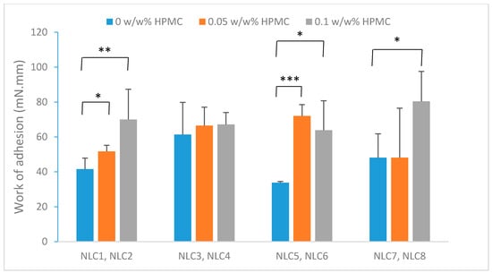 Because of its surface-active property [], HPMC may accumulate at the lipid-water interface, resulting in a concentrated gel layer around the particles. This gel layer can to attach each particle separately to the mucosal surface. The mucoadhesion of the NLC compositions (Table 1) was compared with the same compositions without HPMC and then statistical analysis (T-test) was applied to evaluate the significance. It was found that there is a significant difference between samples with and without the mucoadhesive polymer (Figure 2) in the case of most compositions. Generally, the samples containing a higher surfactant amount (5%) (NLC3 and 4) displayed higher adhesive work values than the compositions with a lower surfactant amount, which can mean remarkable mucoadhesivity even without adhesive polymers. The possible cause of this phenomenon is the different interfacial layer. In these formulations, the addition of the polymer did not change the mucoadhesivity, which can be explained by the fact that the high surfactant concentration limits the orientation of the polymer to the surface of the NLCs. In our compositions, the polymer concentration did not change mucoadhesivity in the investigated polymer concentration range; there was no significant difference between the samples containing 0.05% and 0.10% polymer, which could be explained by the saturated interface of the NLCs, even at a low polymer concentration.