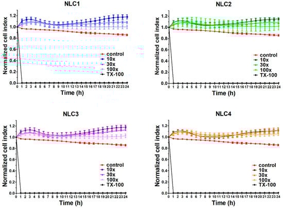 Cell viability of HCE-T cornea epithelial cells treated with different formulations measured by real-time electric sensing. Values are presented as means ± SD, n = 6–10. 10×: 10-times dilution; 30×: 30-times dilution; 100×: 100-times dilution; NLC, Nanostructured lipid carriers; TX-100, Triton X-100.