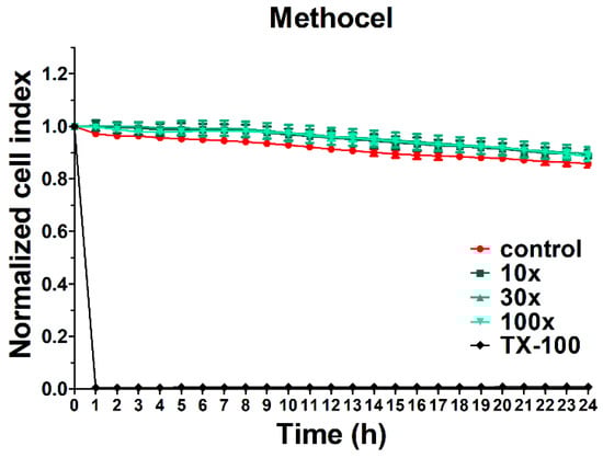 Methocel did not significantly change the cell index of HCE-T cells, which indicates no cytotoxic effect on this cell type (Figure 4) similar to the tested NLCs. The reference compound, Triton X-100 detergent, caused cell death, as reflected by the decrease in impedance.