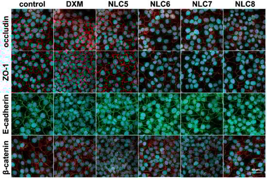 Effects of DXM alone and in formulations (10-times dilution) on junctional morphology of HCE-T corneal epithelial cells. Immunostaining for tight and adherens junction proteins occludin, zonula occludens-1 (ZO-1), E-cadherin and β-catenin after 1-h treatment. Red and green colors: immunostaining for junctional proteins. Blue color: staining of cell nuclei. Bar: 40 µm.