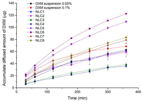 The highest diffused amount of DXM was detectable in the case of NLC6 and 5 (Figure 6 and Figure S2), which contain a lower amount of surfactant, and as we demonstrated above, these formulations had the lowest entrapment efficacy (Table 2). This finding could show us that if less API is entrapped in the nanocarriers (more free DXM), a higher amount will diffuse through the synthetic membrane, and on the other hand, it can mean that the high emulsifier concentration (and/or high entrapment efficiency) in the system can have a restraining effect on DXM diffusion. At lower drug contents (NLC1-4 and 0.5% DXM suspension), the dilution of the acceptor phase during sampling can result in the total dissolution of DXM in suspension form, while the incorporation into a lipid carrier with high entrapment efficacy can hinder this dissolution process into the medium (as it was mentioned above). That is why we could observe a lower diffusion rate in our NLC formulations, which contain a high surfactant and a low API amount, compared with the conventional suspension form. This could explain why NLC3 and 4 with higher entrapment efficacy showed the lowest diffused amount of DXM (Table 2).