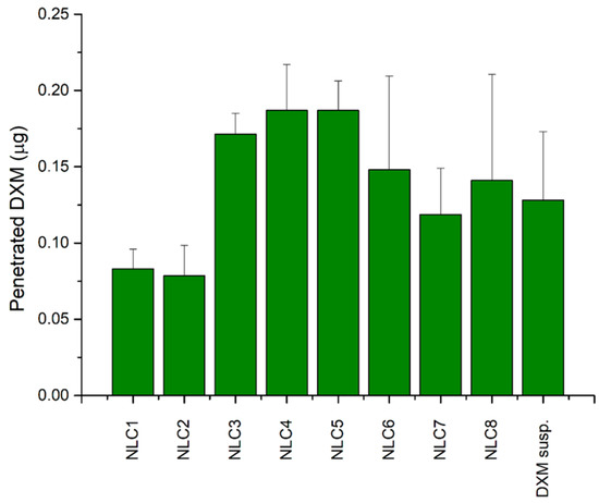 In order to get more information about the expected amount of penetrated DXM through the cornea, a parallel artificial membrane permeability assay (PAMPA) was used. On the basis of the literature data, cornea-PAMPA can be successfully applied for the penetration study of ocular APIs as a fast, cost-effective screening method []. In our study, the penetration of DXM in different NLCs was evaluated and compared with DXM suspension (0.1%) in order to find correlation between the composition and the penetration ability of DXM. The highest penetrated DXM amount was detectable in the case of NLC3, 4, 5, and 6, and there was no significant difference between the penetrated amount of DXM in the case of DXM suspension and NLC1-8 (Figure 7).