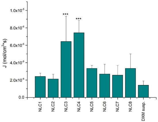 More relevant information can be concluded when the flux values are considered; in this case, the donor concentration of the applied formulations is considered (Figure 8). The comparison of the flux values of the NLC systems with the suspension indicated remarkable penetration when DXM was incorporated in nanocarriers. Surprisingly, NLC3 and 4 showed the highest penetration and a highly significant difference from the DXM suspension form. However, the NLC3 and 4 formulations showed a lower drug diffusion during the in vitro drug diffusion study. This contradiction may be explained by the interaction between the components of the NLCs and the cornea-PAMPA membrane. The applied emulsifier and lipids can modify the permeability of the impregnated PAMPA membrane, resulting in improved penetration. The largest alteration between the PAMPA and the in vitro drug diffusion study can be observed in the case of the compositions with higher surfactant concentration, which can suggest that the interaction occurs between the emulsifier and the membrane, resulting in improved PAMPA penetration.