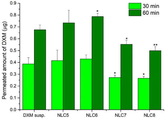 The permeability of DXM from suspension and different NLC formulations was tested on the HCE-T cell model as well. It can be seen that the highest amount diffused in the case of the NLC5 and NLC6 formulations, while the NLC7,8 formulations showed a lower amount of diffused DXM (Figure 9). After 60 min, the diffused amount of DXM was significantly higher for NLC6 than for the suspension form. When there was higher free concentration in the donor phase, the amount of diffused DXM was also higher. This tendency is similar to the one seen during the previous investigation with dialysis membrane. This may suggest that if the entrapment efficiency is higher, DXM can diffuse in a lower amount from the NLC systems.