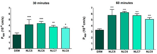 Considering the permeability (Papp) values after treatment, all NLC formulations showed higher values compared to the suspension (30 min: 2.4 ± 0.3 × 10−6 cm/s; 60 min: 3.3 ± 0.2 × 10−6 cm/s), which indicates a better penetration of the API using nano lipid compositions (Figure 10).