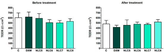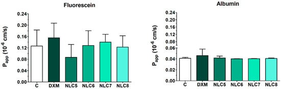 For permeability measurements, NLC5, NLC6, NLC7, and NLC8 formulations were applied at 10 times dilution and DXM at 1 mg/mL concentration, all diluted in Ringer-Hepes buffer.
