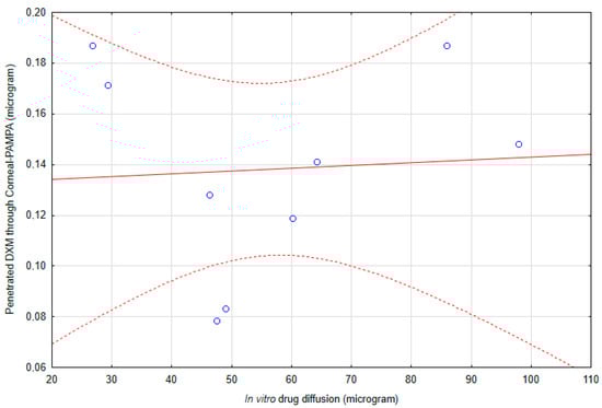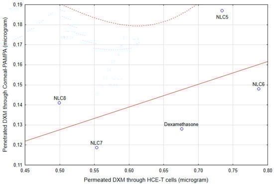 The correlation coefficient between the results of the penetrated DXM though HCE-T cells and the penetrated amount though Corneal-PAMPA is 0.52248, which indicates a moderate correlation [] between these two models (Figure 14). However, as was mentioned above, the component of the NLC can modify the PAMPA membrane, which can alter the permeability in this model, while the cell membrane remained the same in the case of the cell penetration study, which can explain this moderate correlation.