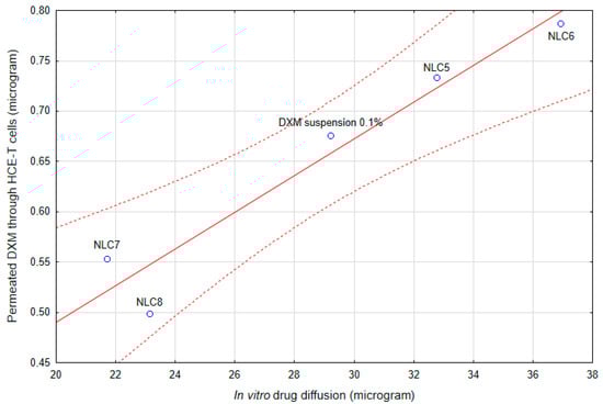 Surprisingly, the correlation between the in vitro diffusion study and the HCE-T cell line permeability study was very high (Figure 15). The correlation coefficient was 0.96595, which indicates a strong correlation. As was presented, the formulations did not change the barrier function of the corneal epithelial cells (immunohistochemistry, Papp of fluorescein and albumin); the main rate-limiting factor for the penetration of DXM in NLC formulations is the drug release from the nanocarriers.