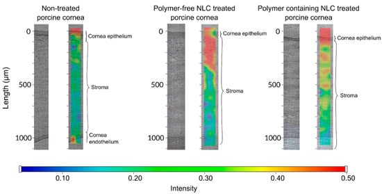 Based on the drug diffusion study and the cell line penetration test, NLC6 was selected for the semi-quantitative Raman mapping examination. The chosen formulation NLC6 was compared with its polymer free version. The porcine corneas were treated with the formulations with NLC6, and without polymer; and the depth of penetration was analyzed.