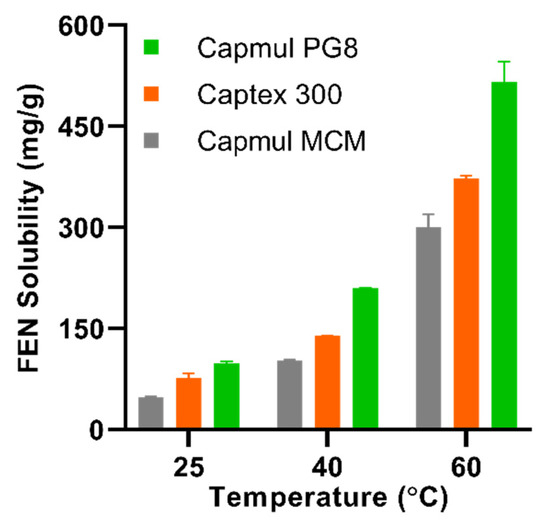 The temperature-dependent solubility of fenofibrate (FEN) in Capmul MCM (grey bars), Captex 300 (orange bars), and Capmul PG8 (green bars). Values represent mean ± SD, n = 3.