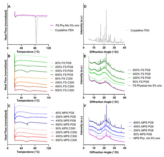Differential scanning calorimetry (DSC) thermograms of (A) crystalline FEN and fumed silica (FS) physical mix 5% w/w, (B) FEN-loaded FS formulations and (C) FEN-loaded mesoporous silica (MPS) formulations. The X-ray powder diffraction (XRPD) diffractograms of (D) crystalline FEN, (E) FS PG8 formulations and (F) MPS PG8 formulations.