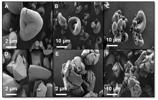 Surface morphology, internal structure, and lipid distribution within fabricated SLH formulations were examined using SEM and confocal laser scanning micriscopy (Figure 3 and Figure 4). Blank FS particles formed semi-spherical shapes of varying particle sizes with distinct concave-like structures (Figure 3A). No difference in appearance was observed between blank FS and 80% FS PG8 (Figure 3B). However, at 200% saturation level, regardless of the lipid used, FS particles appeared to form clusters and large aggregates (Figure 3C). In contrast, MPS appeared as angular structures and formed aggregates irrespective of the lipid used or FEN saturation level (Figure 3E,F). No difference in appearance was observed between SLH prepared with either lipid types; therefore, only SEM images of SLH prepared with PG8 are shown.