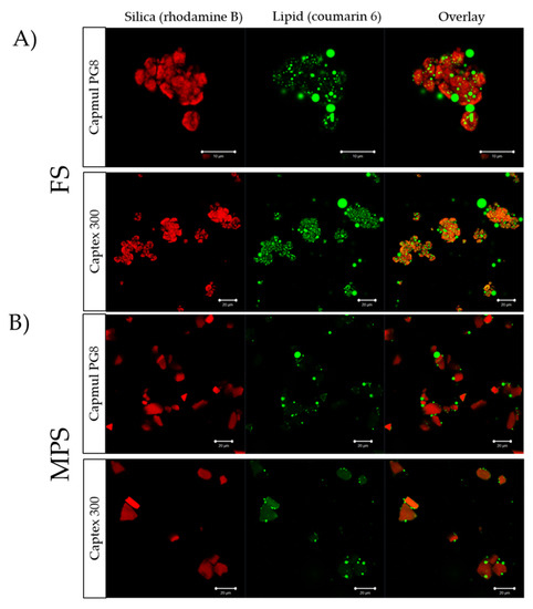 Confocal imaging revealed that the lipid distribution within the silica microparticles was dependent on the type of silica and lipid used. More lipid was observed within the internal structure of FS particles than MPS, evidenced by the intensity of the fluorescently labeled lipid within the pores of the silica microparticles (Figure 4). However, it was evident that PG8 was less prone to imbibe into the porous matrix compared to C300, with lipid droplets tending to reside between inter-particle cavities, irrespective of the silica type. In contrast, C300 homogeneously distributed throughout the internal structure, with the presence of additional lipid droplets between the particles.