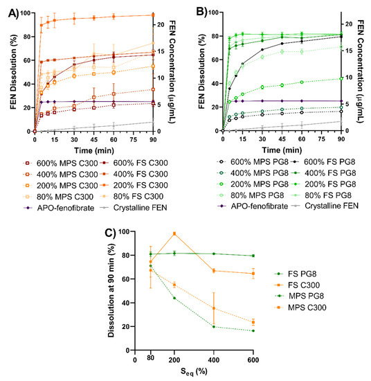 During in vitro dissolution studies (Figure 5), unsaturated (at 80% Seq) MPS and FS formulations had a comparable performance, regardless type of lipid used. In contrast, both the rate and extent of dissolution from super-SLH (200%, 400%, and 600% Seq) were significantly enhanced when using FS compared to corresponding MPS formulations. At higher saturation levels (400% and 600% Seq), it was evident that FS was able to maintain excellent FEN dissolution despite the presence of “crystalline” FEN and less amount of lipid in the formulations. However, the relatively larger amount of crystalline FEN present at 600% FS PG8 and 600% FS C300 resulted in slower release kinetics. In contrast, a reduction in dissolution performance was observed by MPS formulations with an increase in drug load. These findings were consistent with data obtained from FEN aqueous solubilization during in vitro lipolysis, despite the complexity of the data generated due to FEN precipitation.