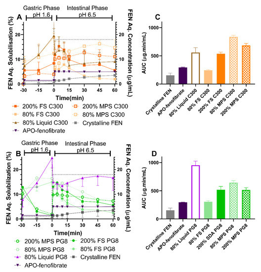 FEN aqueous concentration-time profiles from crystalline FEN, APO-fenofibrate, and FEN-loaded SLH formulations, in fasted state simulated gastric fluid (FaSSGF) (30 min) and fed state simulated intestinal fluid (FaSSIF) (60 min) under digesting conditions, dosed at 3 mg of FEN (mean ± SD, n = 3). (A) SLH C300 formulations and (B) SLH PG8 formulations. Dotted line represents the FEN Seq in biorelevant media. The area under the curve (AUC) of FEN aqueous solubilization-time profile measured during the intestinal phase from (C) crystalline FEN, APO-fenofibrate, and SLH C300 formulations and (D) crystalline FEN, APO-fenofibrate, and SLH PG8 formulations.