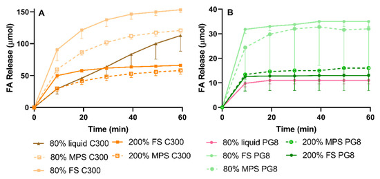 Fatty acid (FA) release-time profile from: (A) C300 formulations and (B) PG8 formulations, during the intestinal phase of in vitro gastrointestinal (GI) lipolysis in FaSSIF for 60 min, dosed at 3 mg of FEN (mean − SD, n = 3).