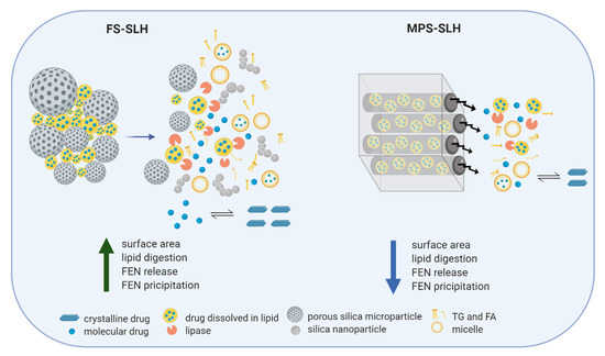 The difference in performance achieved by FS and MPS formulations can be attributed to their unique structure and resulting dynamic microenvironment when re-dispersed in biorelevant media (Figure 8). It is hypothesized that SLH microparticles prepared with FS de-aggregate and dissociate to their precursor silica nanoparticles upon dispersion in aqueous media, providing high surface area for lipase mediated digestion, dynamic mixed micelle formation, and subsequent drug release. For FEN, this results in a more profound precipitation in the closed in vitro digestion model, which lacks an absorption step. In contrast, FEN-loaded lipid droplets need to diffuse out of the 6 nm [29] structured nanopores of the MPS particles. This slows the kinetics of lipid/drug release, hindering lipolysis, which in turn leads to less pronounced FEN precipitation. In addition, MPS formulations were aggregated at all FEN saturation levels, suggesting poor lipid encapsulation which further reduced the surface area available for lipase action.