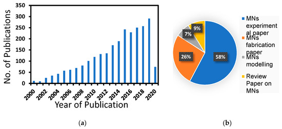 (a) Number of journal articles published related to microneedles (MNs) according to Scopus in between 2000–2020, (b) distribution of papers according to different MN applications (accessed on 17 March, 2020).