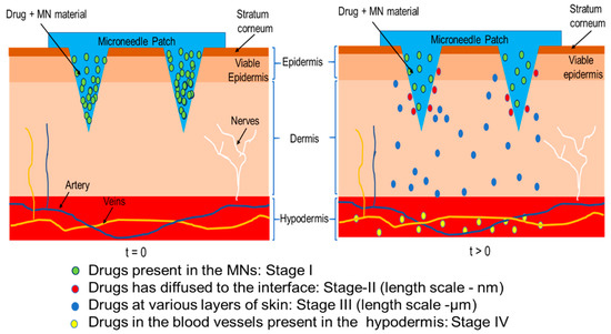 The possibility of developing modelling tools towards achieving MN optimisation and testing in support of experimental studies is beneficial and attractive. It can save both the costs and time by eliminating the need for many time-consuming and expensive experimental trials. Modelling MN based TDD typically deals with the simulation of three coupled sub-domains i.e., MNs, skin, and bloodstream. As shown in Figure 2, the drugs diffuse from the individual MN to the epidermis and/or dermis region of skin and subsequently reach the bloodstream. Figure 2 also shows the length scale and stages of drug transports in the MN. The differences in drug delivery behavior within the skin is due to the difference in the properties of different layers of skin.