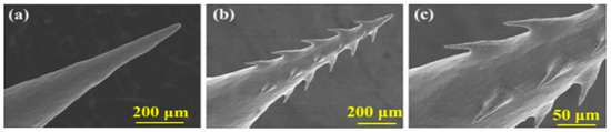 Images of the (a) parent MN, (b) bioinspired MN, and (c) barbs on the parent MN (adopted from [82]).
