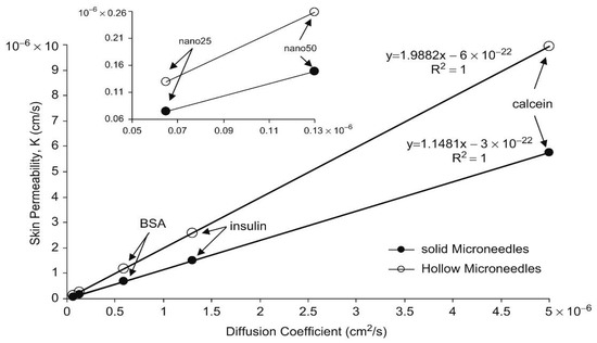 Relationship between the permeability and diffusion coefficient of the optimum solid (n = 20, R = 19 μm and A = 0.04 cm2) and hollow (n = 13, R = 140 μm and A = 0.53 cm2) MNs (adopted from [111]).