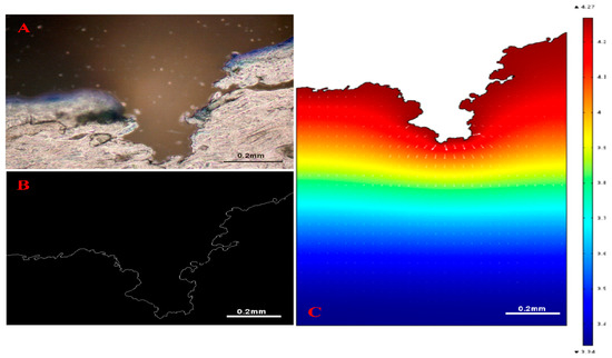 The histological image of sliced skin is processed by a MATLAB-based image processing tool. (A) the original image of skin histology; (B) the outline of the skin captured by the image processing tool and (C) simulated diffusion profile of insulin in MN-pierced skin (adopted from [108]).