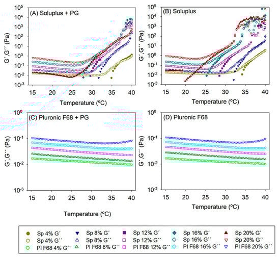 Evolution of the storage (G′) and the loss (G′′) moduli as a function of temperature of (A) PG-loaded Soluplus micelle dispersions, (B) blank Soluplus dispersions, (C) PG-loaded Pluronic F68 micelle dispersion, (D) blank Pluronic dispersions. Total copolymer concentration was 4, 8, 12, 16, and 20% w/w in a PBS pH 7.4 buffer (n = 4).