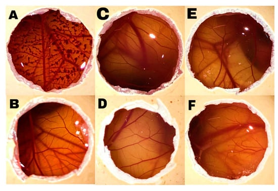Effect of controls and test substances on the surface of the chorioallantoic membrane (CAM) after treatment for 3 min (A) NaOH 0.1 N, (B) NaCl 0.9% w/w, (C) Soluplus (16%), (D) Soluplus (20%), (E) Pluronic F68 (16%), and (F) Pluronic F68 (20%) dispersions in a PBS.