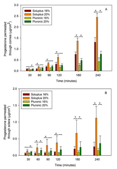 The steady state flux (J) of PG was estimated to be 0.50 ± 0.07, 0.91 ± 0.04, 0.13 ± 0.07, and 0.26 ± 0.04 μg/(cm2·h) for Soluplus 16% and 20% and Pluronic 16% and 20%, respectively through cornea; and 0.08 ± 0.06, 0.37 ± 0.08, 0.04 ± 0.03, and 0.09 ± 0.07 μg/(cm2·h) for Soluplus 16% and 20% and Pluronic 16% and 20%, respectively through sclera. Statistical differences (p < 0.05) were detected at various times between different concentrations of each polymer used as illustrated in Figure 4A,B. As permeability values recorded through cornea and sclera were larger for Soluplus and Pluronic 20% micelle dispersions, these formulations were selected for the studies in different species.