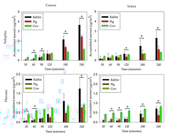 Accumulated amount of PG permeated through rabbit, porcine and bovine cornea, and sclera and measured in the receptor chamber as a function of time. PG was formulated in Soluplus and Pluronic micelles, total copolymer concentration was 20% w/w in all cases (n = 4). * Significant differences were found between the three species (p < 0.05).