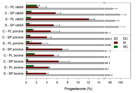 Progesterone (PG, 314.46 g/mol), Pluronic® F68 (8350 g/mol), and PG: Methyl-β-cyclodextrin complex (85.2 mg PG/g; Progresterone-water soluble) were purchased from Sigma-Aldrich Chemical Co. (St. Louis, MO, USA), Soluplus® (115,000 g/mol) from BASF (Ludwigshafen, Germany), acetonitrile was provided from Scharlab SL (Barcelona, Spain), ethanol absolute from VWR (Fontenay-sous-Bois, France), propylene glycol from Guinama (La Pobla de Vallbona, Spain). Ultrapure water was obtained by reverse osmosis (Milli-Q, Millipore Ibérica, Madrid, Spain). All other chemicals used were of analytical reagent grade and used as received.
