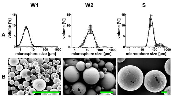 Microsphere size distribution and shape of microspheres. (A) Volume microsphere size distribution of W1, W2 and S microspheres was measured by laser light diffraction. The W1 batch had the smallest microsphere size of about 3.4 µm, followed by W2 (18.2 µm) and S with a microsphere size of about 66.9 µm. Error bars represent the standard deviation (SD) of the volume microsphere size of three independent batches; (B) Shape of the microspheres was visualized by scanning electron microscopy (SEM). All microsphere types had a round shape. W1 microspheres were quite smooth and nonporous. In contrast, some W2 and S microspheres exhibited holes (white arrows) on their surface, and S microspheres additionally showed circular dents as indicated by the blue arrow. Bars indicate 10 µm.