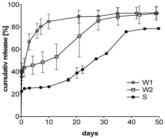 The release of fasudil depended strongly on the microsphere size of the microspheres (Figure 2). The smallest microspheres (W1) had a high burst release of about 65% during the first 3 days, and the monophasic release was completed after only 20 days. Medium-sized W2 microspheres also showed a high burst release of about 40%, which was followed by a sustained release period over 35 days. In contrast, the S microspheres showed a typical triphasic sustained release, over about 45 days starting with a burst release of only about 20% followed by a plateau from day 1 to day 10 where no fasudil was released up to day 10 and followed by an almost linear release from day 17 to day 38.