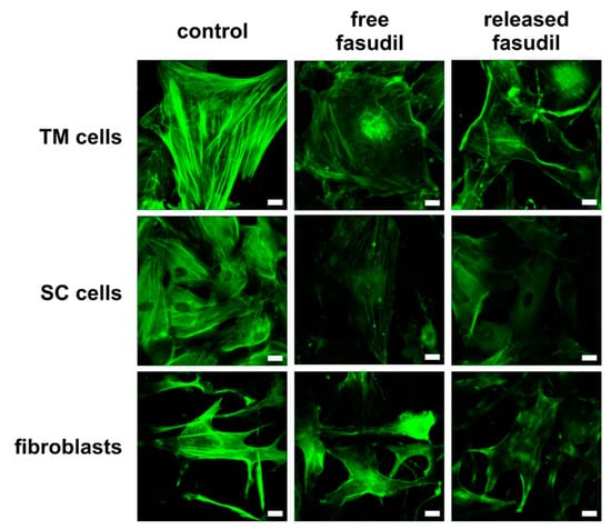 ROCK inhibitors decrease the outflow resistance in the anterior chamber of the eye due to their effects on the cytoskeleton of TM and SC cells [,]. TM and SC cells as well as fibroblasts were treated with free fasudil and fasudil released from microspheres. After staining the actin cytoskeleton with FITC–phalloidin, cells were studied by fluorescence microscopy (Figure 4). Untreated TM and SC cells and fibroblasts displayed numerous thick and longitudinally arranged actin stress fibers. The stress fibers of TM cells and fibroblasts were thicker than those of SC cells, which had a more cortical actin at baseline. In contrast, fasudil treatment (free or released) caused a dramatic reduction of actin stress fibers, and rather a cortical actin cytoskeleton remained. In all cell types, the effect of fasudil released from microspheres was comparable to free fasudil, corroborating that fasudil was not affected by the encapsulation procedure and still biologically active after release.