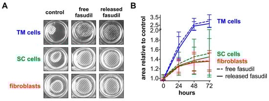 The collagen gel contraction assay was carried out with slight modifications according to Su et al. []: Fibroblasts, TM cells, and SC cells were trypsinized (Pan Biotech GmbH, Aidenbach, Germany) and resuspended at a density of 1.5 × 105 cells/mL in DMEM containing 0.35% FBS and 1.17 mg/mL of rat tail collagen type I (4.00 mg/mL in 0.02-N acetic acid; BD Bioscience, San Jose, CA, USA; (adjusted with 0.02-N acetic acid for the desired concentration). To allow the gel to solidify at optimal conditions, 1-M sodium hydroxide solution was added to adjust the solution to neutral pH. Then, 500 µL of the collagen-cell mixture were transferred to each well of a 24-well plate. The mixture was incubated at 37 °C under 5% CO2 for one hour. After the gel solidified, 500 µL of DMEM containing 0.35% FBS supplemented with controls, free or released fasudil for a final concentration of 25 µM was pipetted onto the collagen gels. Gels were carefully dissociated from the wall of the culture wells using a hypodermic needle. After 0, 24, 48 and 72 h, culture wells were tangentially illuminated and photographed (EOS 750D, Canon, Tokyo, Japan) from above with a fixed distance in front of a dark background. The areas of the matrices were measured using ImageJ software (version 1.52d, U.S. National Institutes of Health, Bethesda, MD, USA) []. For normalization, the mean areas measured in controls was set at 1 (n = 4).