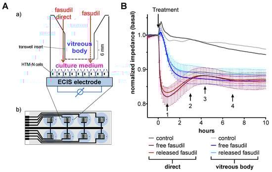 The impact of fasudil on HTM-N cells was monitored by noninvasive impedance readings. A schematic illustration of the experimental setup is shown in Section 3.5. HTM-N cells were seeded in 8-well plates milled into a poly(methyl methacrylate) block with a well diameter of 16 mm each. In order to allow for ECIS measurements, the bottom of the well was made from a polycarbonate (Lexan®) base substrate coated with a gold electrode layout generated by sputter deposition of gold and subsequent photolithographic patterning. The bottom plate with the electrode layout was glued to the 8-well block using a biocompatible silicon adhesive. Cells were either treated directly by replacing half of culture medium with fresh culture medium containing controls, free or released fasudil for a final concentration of 25 µM; or samples were premixed with 200 µL vitreous body of fresh enucleated porcine eyes (purchased from a local slaughterhouse) by vortexing them and putting them into 6.5 mm Transwells® with a polycarbonate membrane holding 108 pores per cm² of 0.4 µm pore diameter each (Corning, Inc., Corning, NY, USA). The height of the vitreous body in the insert was 6 mm. Experiments were performed at 37 °C under 5% CO2. Relay bank, lock-in amplifier and software for the ECIS data acquisition and analysis were obtained from Applied BioPhysics (Troy, NY, USA). The impedance values of each well were recorded at an alternating current frequency of 8 kHz every 4 min over the entire time of analysis. Impedance values are presented as the values captured along the experimental time course normalized to the impedance values recorded immediately before addition of test substances. Two independent experiments were performed. Due to the 8-well-format of the experimental setup, all fasudil containing samples (free- and released fasudil) were performed in triplicate and control samples were performed in duplicate.