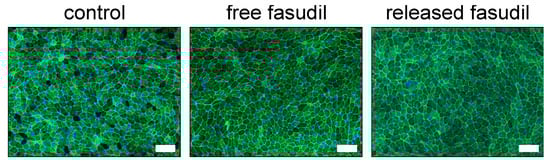 Fasudil that is released in the vitreous body may also come in contact with cells of the posterior chamber of the eye. Therefore, the effect of fasudil—either free or released—on the actin cytoskeleton of ARPE-19 cells was investigated. After staining the actin cytoskeleton with FITC–phalloidin, cells were visualized by fluorescence microscopy (Figure 7). Both untreated cells and cells that were treated with fasudil showed characteristics of a healthy retinal pigment epithelium (RPE), including defined cell borders, a cobblestone-like monolayer and a well-organized actin cytoskeleton, suggesting that fasudil at a concentration of 25 µM did not negatively affect ARPE-19 cells.