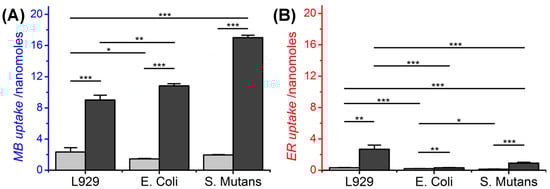 Uptake of MB (A) and ER (B) in L929 cells, E. Coli and S. Mutans following 2-h incubation in 100 μL of PS-supplemented PBS solution. (■): 20 μg mL−1 PS (i.e., 6.25 nmoles MB, 2.27 nmoles ER, 100 μL); (■): 200 μg mL−1 PS (i.e., 62.5 nmoles MB, 22.7 nmoles ER, 100 μL).* p < 0.05, ** p < 0.01, *** p < 0.001 (t-test, n = 3).