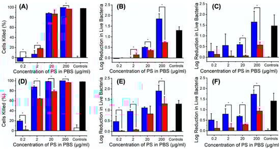 ATP toxicity assay on L929 cells (A,D), E. coli (B,E) and S. mutans (C,F) when treated with PS-supplemented PBS solutions. (A–C) 60-min dark incubation. (D–F) 60-min light exposure. (■): MB-supplemented solutions. (■): ER-supplemented solutions. (☐): PBS negative control. (■): OPDEGE positive control. * p < 0.05 (one-way ANOVA with Tukey HSD test, n = 3).