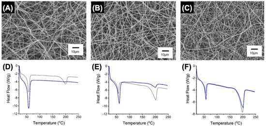 SEM and DSC analyses of electrospun fibres MB20-PLGA20-CL80 (A,D), MB20-PLGA50- CL50 (B,E) and MB20-PLGA80-CL20 (C,F). Grey DSC curves refer to the MB-free fibre controls.
