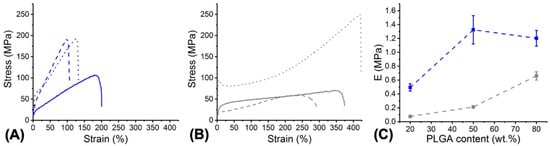 Typical tensile stress–strain curves of PAFs (A) and MB-free fibre controls (B). (—): MB20- PLGA20-CL80; (---): MB20-PLGA50-CL50; (···): MB20-PLGA80-CL20. (—): PLGA20-CL80; (---): PLGA50-CL50; (···): PLGA80-CL20. (C) Variation of Young’s modulus (E) in PAFs (■) and MB-free controls (■) made with varied PLGA content. Lines are guidelines to the eye.