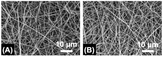 SEM of electrospun fibres MB2-PLGA50-CL50 (A) and MB10-PLGA50-CL50 (B).