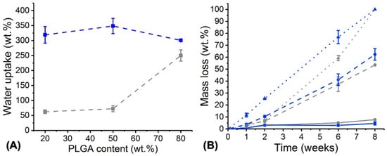 Following the water uptake measurements, an 8-week hydrolytic degradation study was carried out, whereby the sample mass loss (Figure 6B) and microstructure (Figure 7) were assessed at specific time points.