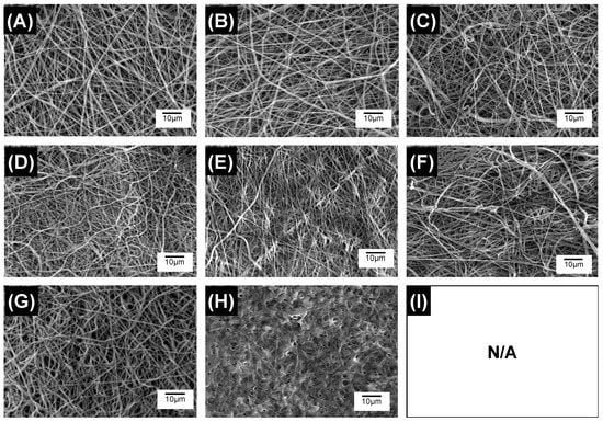 SEM of MB-encapsulated fibres during 8-week hydrolytic degradation (37 °C, pH 7.4). (A–C) MB20-PLGA20-CL80 at week 2 (A), 6 (B) and 8 (C). (D–F) MB20-PLGA50-CL50 at week 2 (D), 6 (E) and 8 (F). (G–I) MB20-PLGA80-CL20 at week 2 (G), 6 (H) and 8 (I) (completely degraded sample).