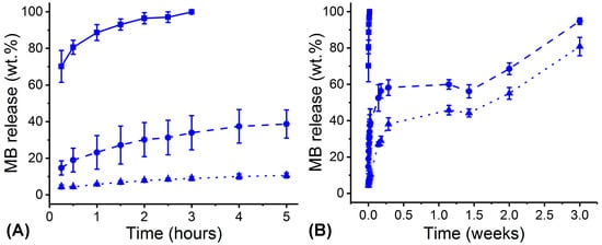 The observed water uptake and degradation characteristics of PAFs were then considered to study respective MB release capability. In contrast to the complete release of MB described by sample MB20-PLGA20-CL80 within 3 h (Figure 8A), fibres with increased PLGA content revealed a significantly increased retention of MB, whereby samples MB20-PLGA80-CL20 and MB20-PLGA50-CL50 released 95 wt.% of MB only after 3 weeks (Figure 8B). Selected PLGA-rich fibres also indicated a slower release with respect to Indocyanine green-encapsulated PLA fibres [33], whereby ~65 wt.% release was observed within 1 week in PBS despite only 1 wt.% mass loss being recorded. In contrast, an even slower release than the one reported in this study was reported with curcumin-encapsulated polyurethane fibres with low hydrolytic degradability (≤ 5 wt.%, 2.5 weeks) [24], a result that was attributed to the hydrophobic interactions between curcumin and the fibre-forming polymer.