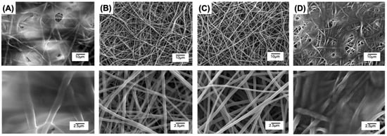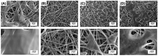 SEM of electrospun fibres cultured with L929 cells for 7 days. Prior to 7-day culture, L929 cells were seeded on cell culture medium-equilibrated fibres and exposed to 60-min light irradiation. (A): PLGA50-CL50; (B): MB20-PLGA50-CL50; (C): MB10-PLGA50-CL50; (D): MB2-PLGA50-CL50.