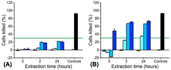 Extract sample solutions were prepared by incubating previously accomplished UV-disinfected samples in 5 mL of PBS at 37 °C for 0, 2 and 24 h. In parallel, L929 murine fibroblasts were seeded onto an opaque walled 96-well plate at a density of 5 × 103 cells per well with 100 μL of complete α-MEM and incubated for 24 h (37 °C, 5% CO2) to allow for cell attachment. The cell culture medium was then removed and each well washed with fresh PBS, prior to addition of the extract solutions. Control wells contained fresh PBS with cells (negative control) and 10 vol.% OPDEGE solution in PBS (positive control). Following a 10-min incubation, the well plates were either exposed to light for 60 min or wrapped with aluminium foil and exposed to light for the same period of time (dark control). Following light treatment, an ATP luminescence assay (Promega) was carried out to quantify cell viability, according to manufacturer instructions. Briefly, 100 μL of CellTiter-Glo® 2.0 solution was added to each well, and the well plate covered with aluminium foil and shaken at 200 RPM for 5 min, prior to 25-min equilibration at room temperature. On each plate, luminosity readings of each tested sample group were compared to the averaged luminosity of the negative dark control (fresh PBS with cells and dark light exposure) to determine the percentage of killed cells, according to Equation (2):